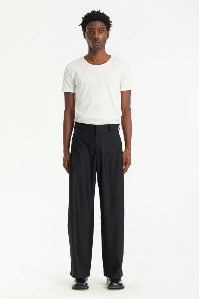 Wide-cut suit trousers with jetted pockets and unique triple pintucks to the sides. S: Length: 103cm, Inside Leg: 70cm, Leg Opening: 25cm, Rise: 32cm, Thigh (Across Width): 31cm, Waist: 29″. M: Length: 104cm, Inside Leg: 71cm, Leg Opening: 26cm, Rise: 33cm, Thigh (Across Width): 32cm, Waist: 31″. L: Length: 105cm, Inside Leg: 72cm, Leg Opening: 27cm, Rise: 34cm, Thigh (Across Width): 33cm, Waist: 33″. 49% Polyester, 48% Viscose, 3% Elastane. Model Height: 185cm. Model Wears: M.