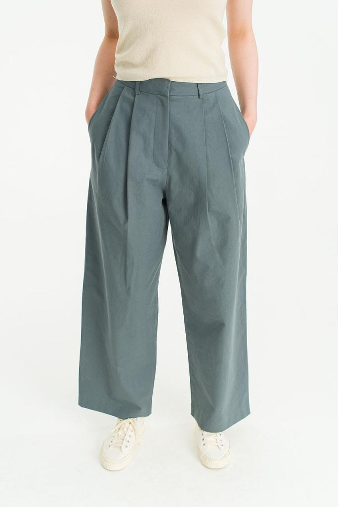 These cotton pintuck trousers are cut for a wide leg fit. Featuring deep side pockets, classic belt loops and a durable metal zipper. S: Length: 104cm, Inside Leg: 70cm, : 26cm, Waist: 26″. M: Length: 106cm, Inside Leg: 71cm, : 27cm, Waist: 30″. L: Length: 108cm, Inside Leg: 72cm, : 28cm, Waist: 32″. 100% Cotton.