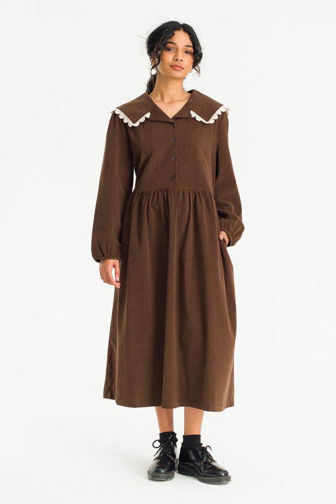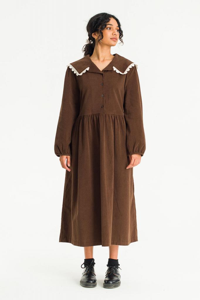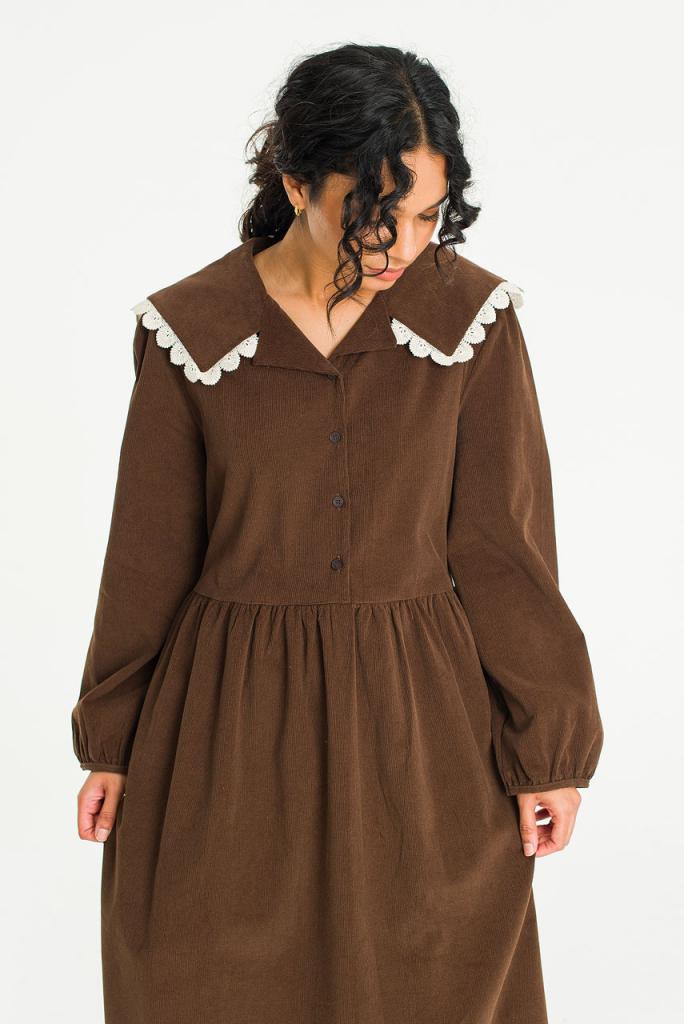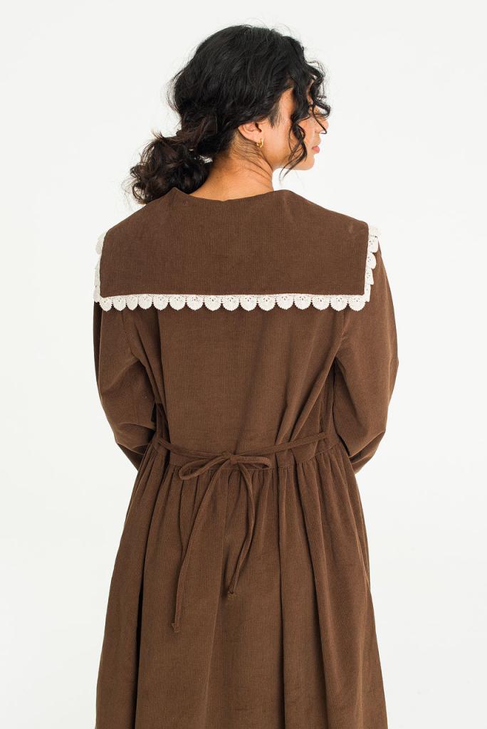 This charming dress is finished in a soft fine cord. Featuring a lace trimmed sailor collar, buttons to the front and a ribbon tie to the waistline to customise the silhouette. UK size 8 can expect a boxy fit, whilst a UK size 12-14 will wear it slightly more fitted. One Size: Length: 120cm, Across Width (Bust): 53cm, Sleeve: 40cm. 100% Cotton.