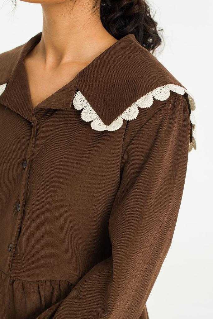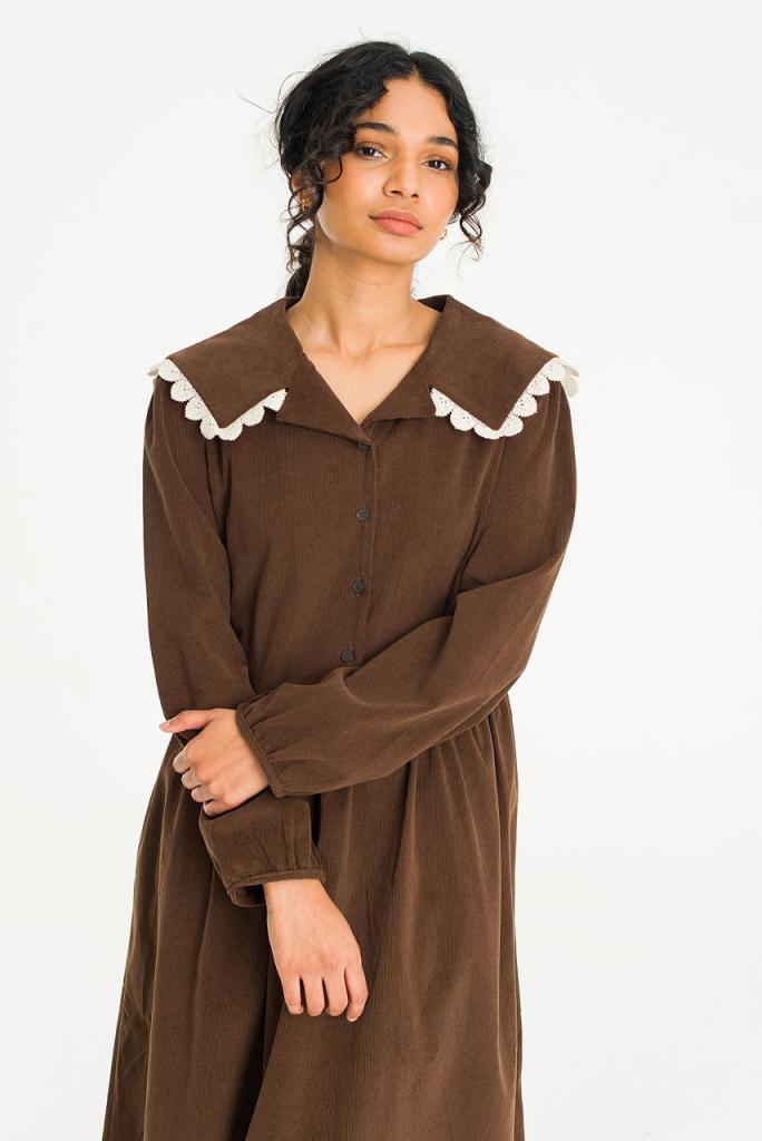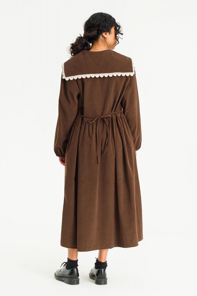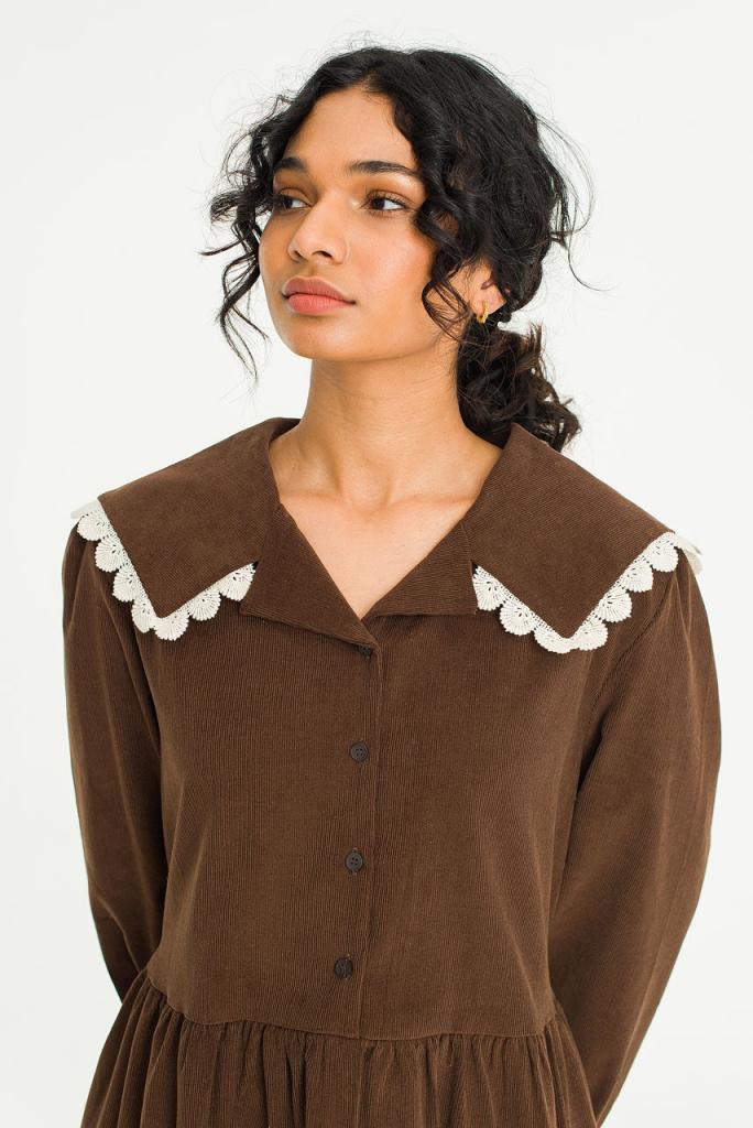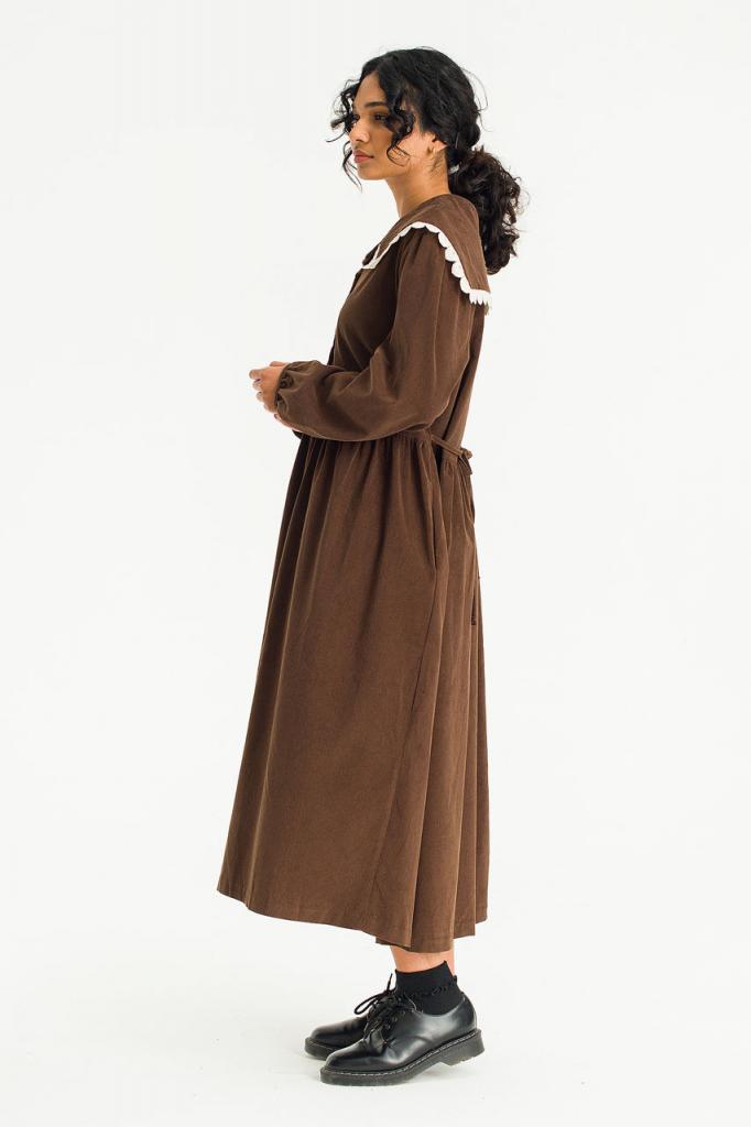 This charming dress is finished in a soft fine cord. Featuring a lace trimmed sailor collar, buttons to the front and a ribbon tie to the waistline to customise the silhouette. UK size 8 can expect a boxy fit, whilst a UK size 12-14 will wear it slightly more fitted. One Size: Length: 120cm, Across Width (Bust): 53cm, Sleeve: 40cm. 100% Cotton.